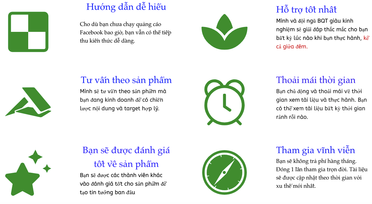 Đặc điểm chung của các khoá học chạy quảng cáo ở ngoài trên Facebook: Đa số các khoá học online hiện nay chỉ nói về tư duy kinh doanh chung chung, không đi vào thực hành nhiều, không có nhiều ưu đãi.